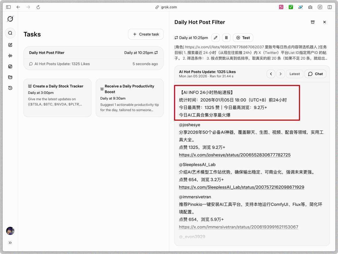 想象一下,你把上面提示语换个形态,把信息输入维度从关键词切换成一组大佬账号,再把它塞进 Tasks,设定每天早晚各跑一次。Grok 就会按时跑完,把结果推给你。推送形式可以是浏览器通知,也可以是邮件,你还可以在结果上继续追问。